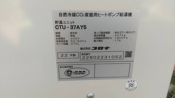 国富町 コロナ自然冷媒CO2家庭用ヒートポンプ給湯機 貯湯ユニットCTU-37AY5 エコキュート交換工事